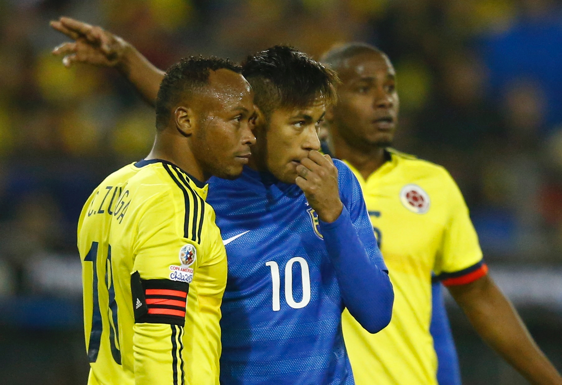 Zuñiga irritou o atacante brasileiro no estádio Monumental, do Chile. Depois de ser agarrado em um lance na área, Neymar viu seu nariz sangrar e rebateu. Ele reclamou com a arbitragem e com o goleiro Ospina, da Colômbia, ironizando uma ligação de pedido de desculpas do lateral colombiano depois da Copa de 2014 ao fazer o gesto com as mãos e soltar: